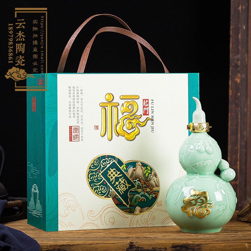 2斤青釉金福字葫蘆兩瓶帶盒套裝送禮陶瓷酒瓶