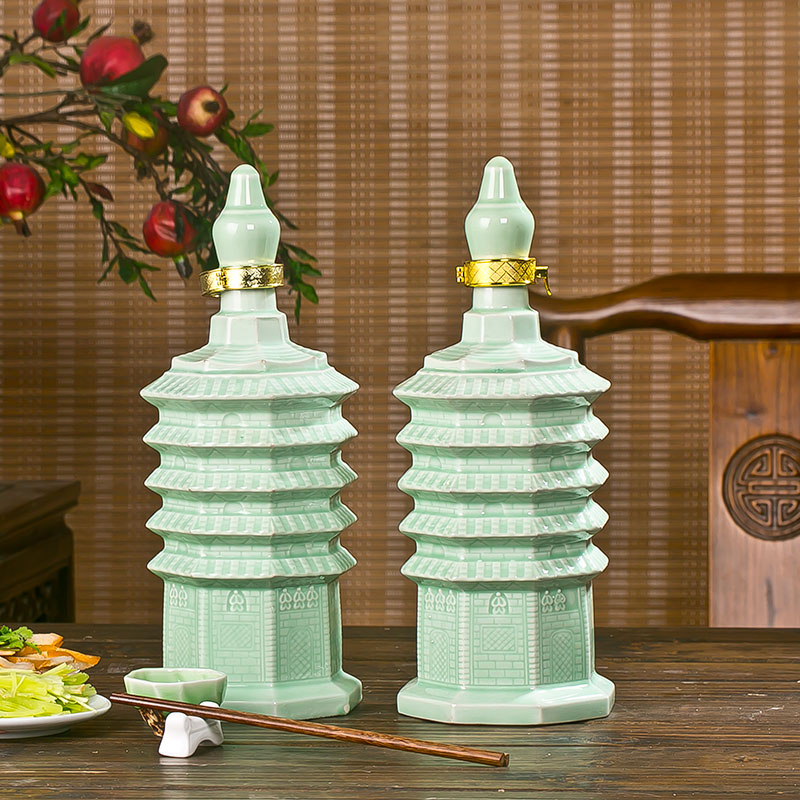 2斤綠釉寶塔創(chuàng)意陶瓷空酒罐白酒空酒瓶帶盒套裝